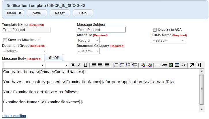 For information on how to define parameter and embed a hyperlink, see Embedding Links to Record Detail Page.Display in ACA Only templates related to examinations and EDR (Electronic Document Recognition) have the Display in ACA field. Select this option to display the notification as an announcement in Citizen Access. For complete details on how to set up Announcements, refer to the Citizen Access Administrator Guide, “Global Settings Configuration” section. Display as Alert Select this option to display an alert informing agency users that they successfully configured the communication. Save as Attachment Select this option to enable the attachments settings that define whether and how Civic Platform attaches notifications to records or email recipients. Attach To This setting is only available for system-level templates, and becomes available when you select the Save as Attachment option. Select Record in the drop-down list to save the email notification as an attachment to associated records.