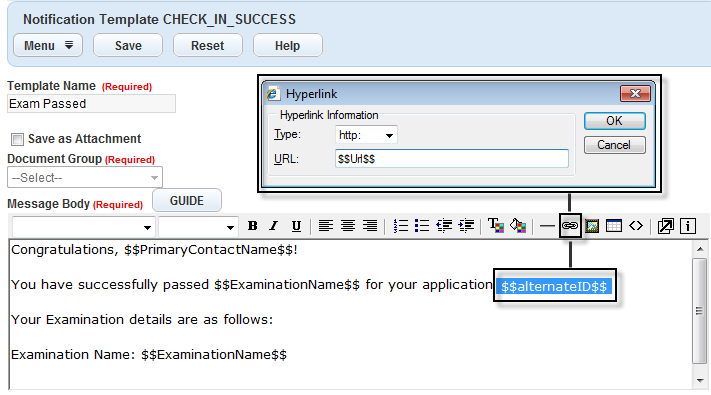 You can add parameters to the subject and body of the message. You must declare and assign parameter values in the EMSE scripts. When the specified event or a batch job occurs, the email notification generates and the parameters populate with the matching value passed from the scripts. Parameters are not case-sensitive, but you must enclose them in a pair of double-dollar signs “$$” for example, $$ExaminationID$$. Refer to Embedding Links to Record Detail Page for more details.