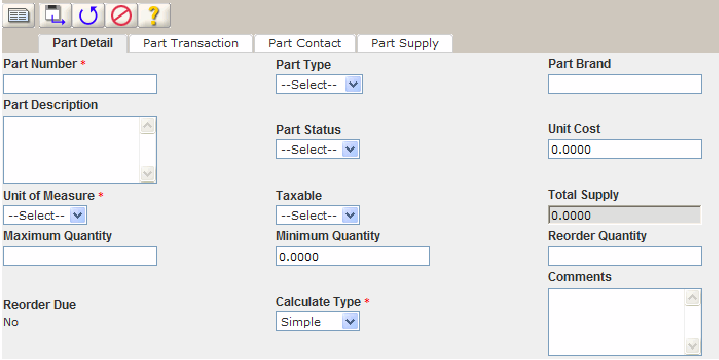 Enter the Part Number if you have it. If you do not have the Part Number, select the Part Type, and then enter the Part Description and Part Brand.