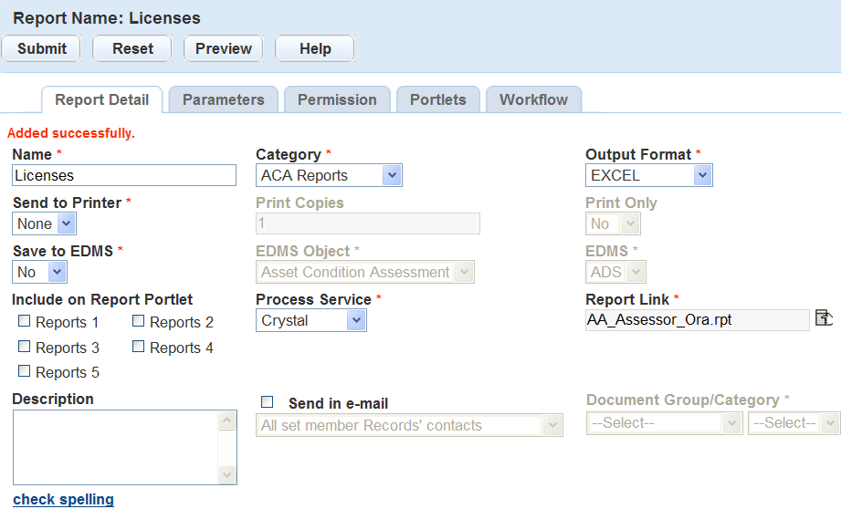 When adding a report to the reports administration, you must specify the report process service such as Crystal, Oracle, Microsoft Reporting, Accela Report Writer, RTF, or URL Report. This identification sends the request to execute the appropriate report engine when a user runs a report. Depending on the report service, different formatting options are available including Adobe Acrobat (.pdf), Microsoft Excel (.xls), Rich Text Format (.rtf), and many others. A preview of each report is available from the Report Detail form portlet. Use the preview to confirm that the correct reporting engine launches and the correct report displays before moving on to additional setup and configuration steps.