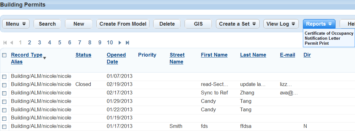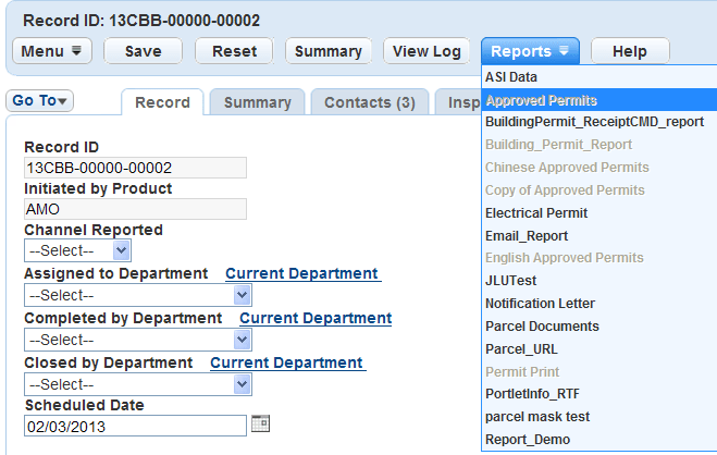 Users can run reports against a single record or small set of specific records. These portlet-specific reports are accessible from the reports menu located on a list or form portlet, as shown in the screen shot below. Examples of these reports include Permit Print, Certificates of Occupancy, and notifications.