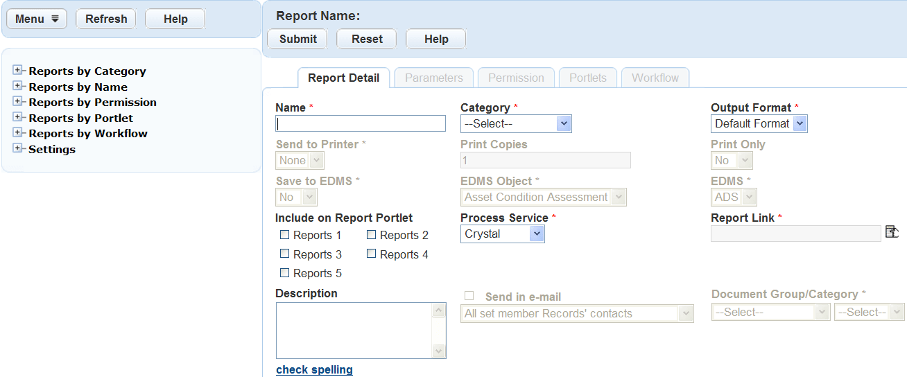 You can save reports to an Electronic Document Management System (EDMS), except for client executable reports, which you cannot save to an EDMS. With the EDMS options in the Report Detail form, you can set the report to automatically save to the EDMS and categorize the report into a document group. You can also save reports to specific objects such as Record, Parcel, Workflow, and Asset Inspection. For more information on saving reports to EDMS, see Saving Reports to a Document Management System.
