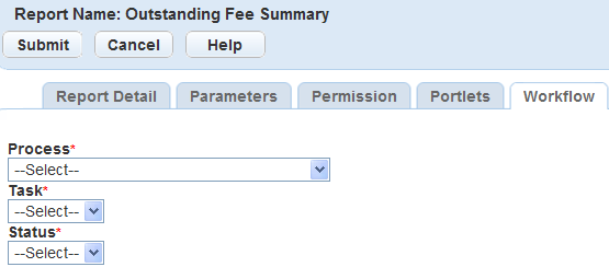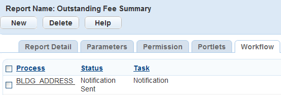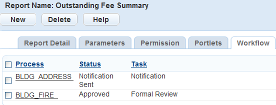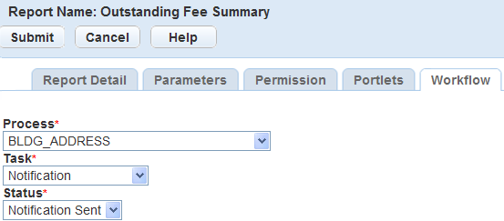 Table 4. Reports by Workflow Field Definitions Process Select the workflow process. For example, to print a building permit at the end of the application acceptance process, select Building. Status Select the workflow task status that should trigger the report. For example, if you want to print a building permit at the end of the application acceptance process, you might select Complete. Task Select the workflow task you want to associate with the report. For example, to print a building permit at the end of the application acceptance process, select Application Acceptance.