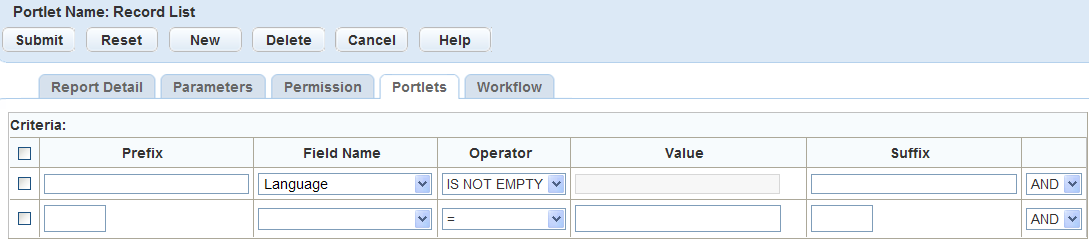 Prefix Enter the prefix for the field name you want to use to set the criteria. You can also use Prefix to handle complicated criteria using brackets for the LIKE and OR expressions. See screen shot below. Field Name Select the portlet field for which you want to set criteria on the selected portlet. For example, to set criteria for building permits with an Approved status, select a field name of Status, and Operator of =, and a Value of Approved. Operator Select the appropriate operator you want to use in the criteria formula for the selected field. For example, to set criteria for building permits with an Approved status, select a field name of Status, and Operator of =, and a Value of Approved. Value Enter the appropriate value used to determine the criteria. For example, to set criteria for building permits with an Approved status, select a field name of Status, and Operator of =, and a Value of Approved. You can also use the wildcard % with the value. For example, to include all Permit Types that start with “Building,” use the value “Building%” with the wildcard. Suffix Enter the suffix for the field name you want to use to set the criteria. You can use Suffix to close complicated criteria using brackets in the Prefix for LIKE and OR expressions. See screen shot below. AND/OR Select one of the following to join two or more criteria conditions.AND operator displays a row of ALL conditions listed that are true. OR operator displays a row of ANY of the conditions listed that are true. Figure: Prefixes and Suffixes in Report Criteria