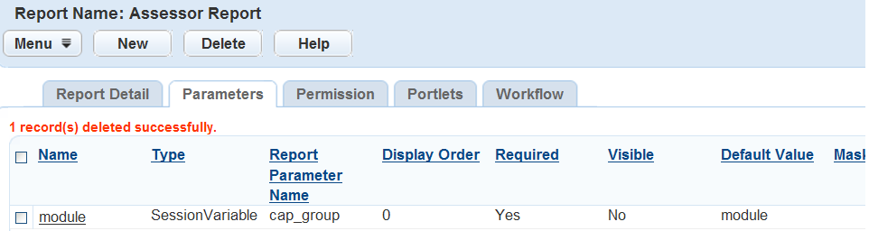 Use default values for parameters that generally do not change. You can also use default values to set or hard-code parameters, such as record type. The record type in a report run from a specific record portlet such as Building does not change. To hard-code a value, the parameter must not be visible in the parameter prompt window, and you must enter the value as the default value.