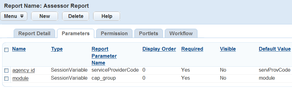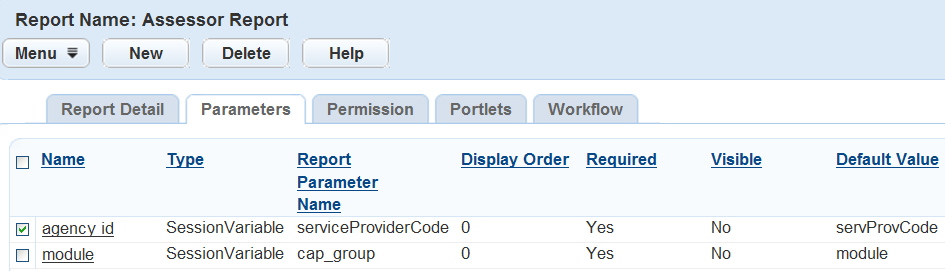 Report parameters must exactly match the spelling of the parameter in the physical report. This includes parameters users must enter manually, as well as those provided by Civic Platform and automatically sent to the report. An example of an Accela provided parameter is record ID. The Building portlet supplies the record ID and automatically displays it on the report.