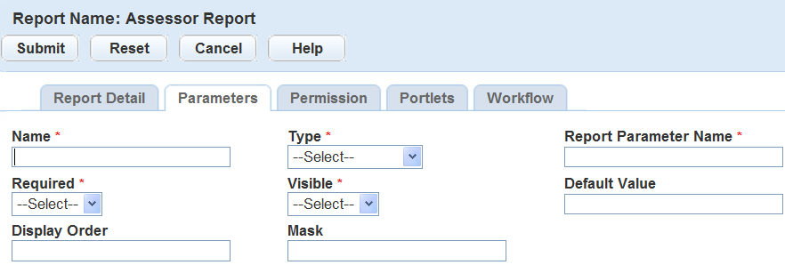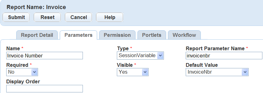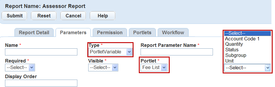 To link reports to a portlet and have values from the portlet passed as parameters, select the type as PortletVariable. For example, you can create a Trust Accounts detail report that links to the Trust Account list portlet or detail portlet. When users run the report, information from the selected trust account portlet acts as parameters for the report.Visible Use the drop-down to select if the parameter should or should not display in the parameter prompt window.
