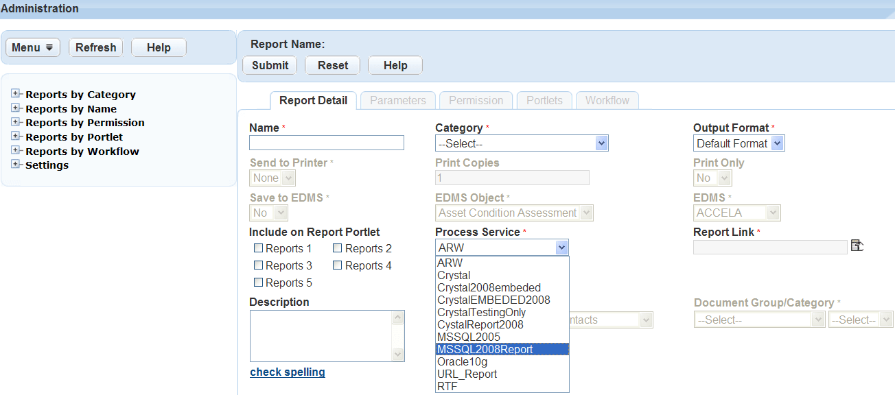 SSO authentication is applicable to Oracle Report 10g/11g.Environment Enter the name or ID of the environment the Crystal Report should run from. You can use the same report service for multiple environments; for example, a production environment and a training environment. Civic Platform requires this field only for the Crystal Report type. Password If your MS SQL Reporting Service requires Civic Platform to authenticate itself, enter the password from the user name and password account you created for the Reporting Service in IIS or through the Computer Management console. Report Name List URL Enter the URL to the directory where you are storing your reports. Civic Platform uses this URL to display the reports that appear in the Report Link popup window when setting up a new report. The URL should include the server name and the folder structure to locate the reports, as shown in the following example: Example Report Name List URL: http://reporting.accela.com/infospc/ReportManagerment/searching/getRptName.jspThis field is not applicable for the report type Client_EXE because it launches an executable file on the user’s workstation and does not access the server for the report directory location. Report Output Format Select each report format that is compatible with the reporting service. For report type Client_EXE the only use .doc, .rtf, or .xls formats. Report Service Name Enter the name used to describe the report service. For example, CRYSTAL or ORACLE. After you save the report service, this option appears in the drop-down list in the Report Detail form portlet. For an example, see Figure 1. Report Service Type Select the type of reporting service you are using to launch reports. Options: Accela Report Writer (ARW), Client_EXE, Oracle Report, Microsoft Report, Crystal Report. Note:Report service settings vary depending on the report type.