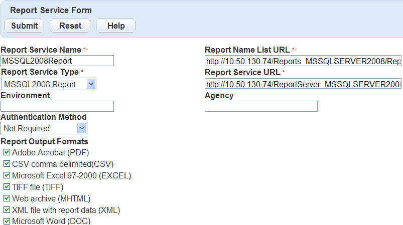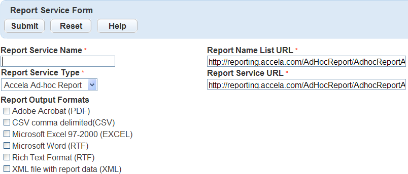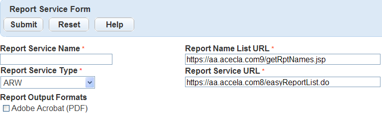 Updates to the Report Service Name and Report Output Formats change the options that appear in the Report Detail form. For example, if you clear the check box for the Adobe Acrobat (PDF), this option is no longer available for reports using that report service.