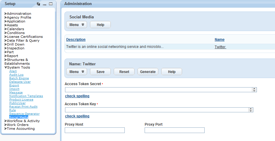 Generate an access token key and an access token secret from Twitter and register them in Civic Platform. The token key and the token secret become the login credentials users enter to post Twitter messages from within Civic Platform.