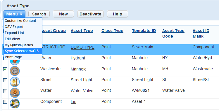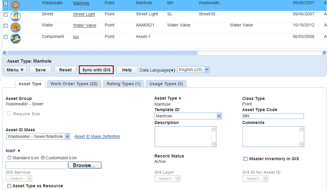 If you want to synchronize only one asset type, select the asset type on the list, and click Sync with GIS on the Asset Type detail pane below the asset type list. For example: