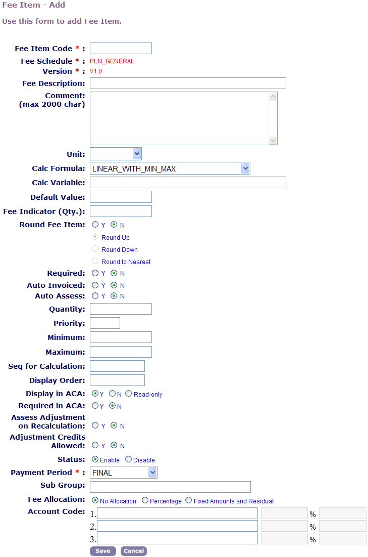 Required If you want to require users to complete the Quantity field, choose Y; otherwise, choose N. Auto Invoiced If you want to automatically invoice the fee item, select Y, otherwise, choose N. No indicates that you want to manually invoice the fee items in Civic Platform. Note:This field does not effect the Fee Item display on the Fee Page or Fee Estimate Page in Citizen Access.