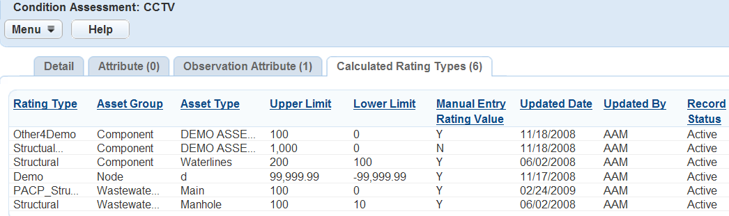 You can link each Condition Assessment to a Rating Type. Condition Assessment forms display both the rating given in the condition assessment and the previous rating. Administrators can view the Calculated Rating Types associated with a Condition Assessment.
