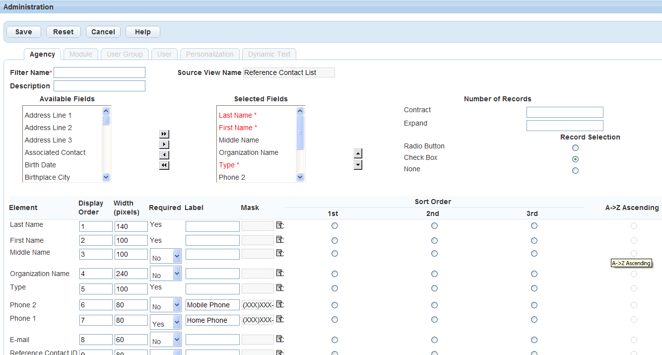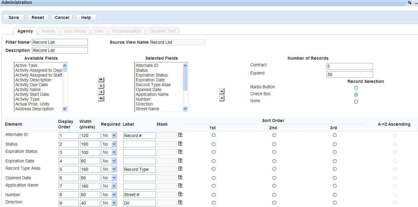 Source View Name Civic Platform identifies the name of the form you are modifying. Width Enter the number of pixels for the column width. Z > A Descending Select this option to further sort a selected sort order field in a descending order alphabetically from Z to A. This option is available when you select a sort order for a field.