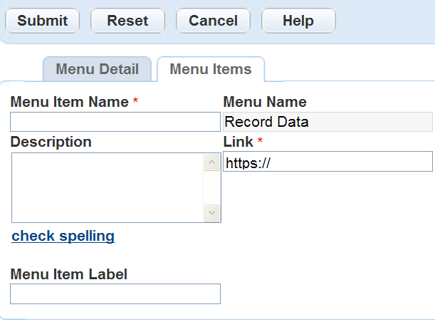 Table 3. Custom Menu Item Detail Fields Description Enter a description for the menu. Link Enter a valid URL of the website for the custom menu item. Menu Item Label Enter the label for the menu item that you want to display in the drop-down menu. Menu Item Name Enter the name of the menu item. Menu Name The name of the menu for the menu item displays as read-only