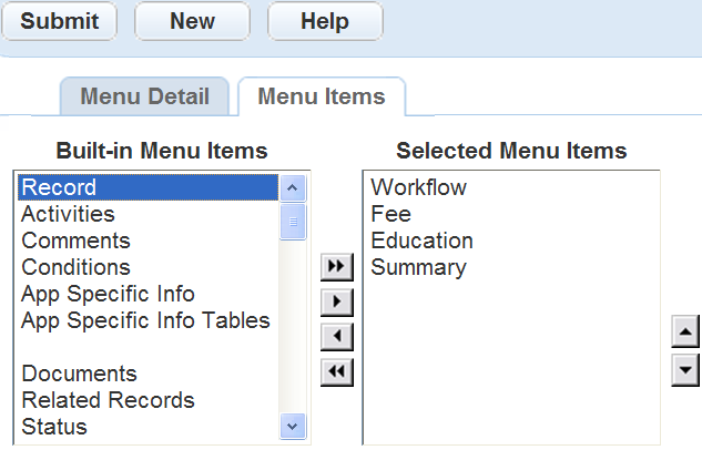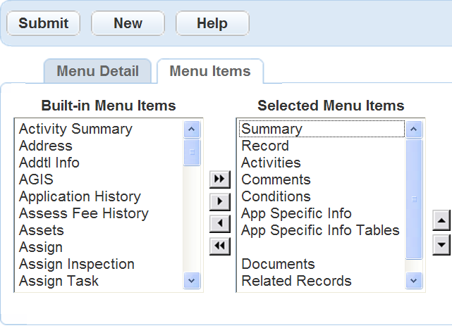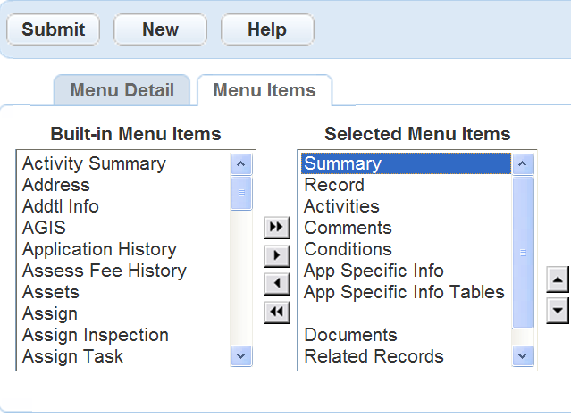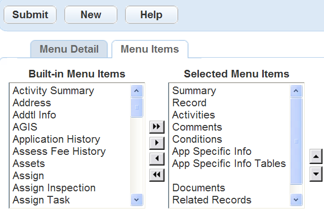 Built-in menu items are the default menu items in Civic Platform. You create a menu by adding and arranging menu items in a list. A menu is complete after you add the menu items, arrange them, and organize them in the drop-down list. You add menu items at the same time you create a menu or when modifying existing menus. You can add up to a maximum of 16 menu items to a menu.