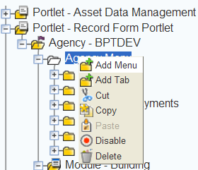 Delete menus you no longer need using the right-click options available in the left navigation portlet. Deleted menus no longer display in the drop-down menu for the specified detail form portlet.