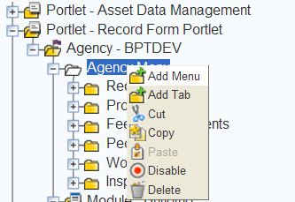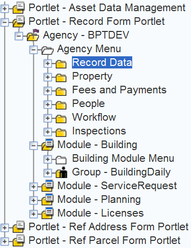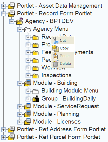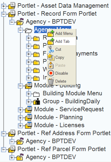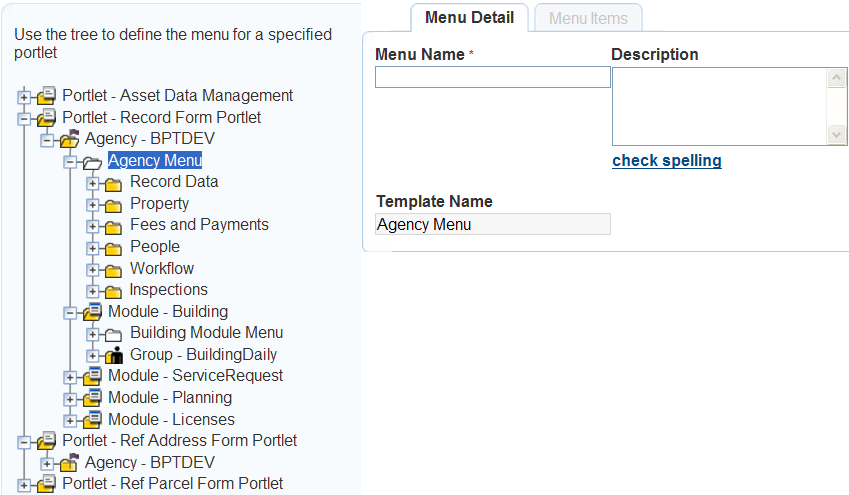 Template menus provide a starting place for creating custom menus and tabs for the entire agency or for individual modules or groups. For example, if you want to create a menu specific to the building module, you can copy and modify the agency template menu. You can also create a separate template menu for the building module with tasks specific to the users within the building department.