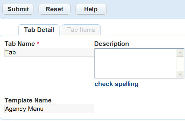 Description Enter a description for the tab menu. Tab Name This read-only field displays “Tab,” the default name reserved for tabs. Template Name This read-only field displays the template name. Click Submit.