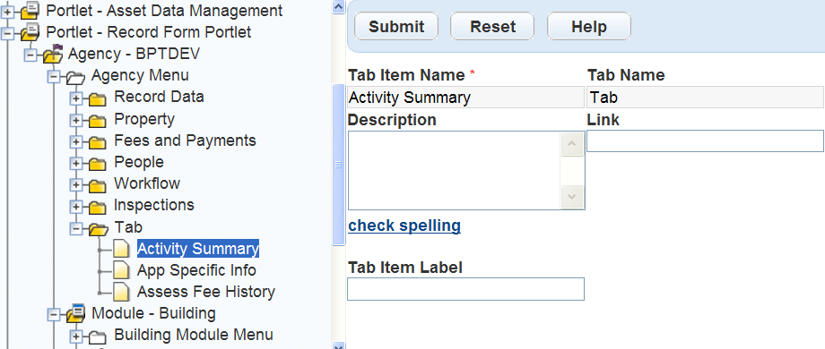 Table 1. Template Menu Fields Description Enter a description of the menu. Menu Template Name Enter a name for the template menu. For example, you might name a menu template for the building module Default Building Menu. Portlet Name The portlet where the menu displays. Civic Platform assigns this name automatically; it is read-only. Show All Tabs Select Yes or No to set whether all tab items display as the record detail tabs. Table 2 shows what tab items display as the record detail tabs at different custom tab and “Show All Tab” settings. Status Select Enabled to display the menu. Select Disabled to hide the menu. Table 2. Tab Items to Display as Record Detail Tabs “Show All Tabs” Setting Custom Tab Configured What Tab Items to Display as Record Detail Tabs? Yes Yes Customized tab items Yes No All built-in tabs No Yes The first custom tab item No No The Summary tab