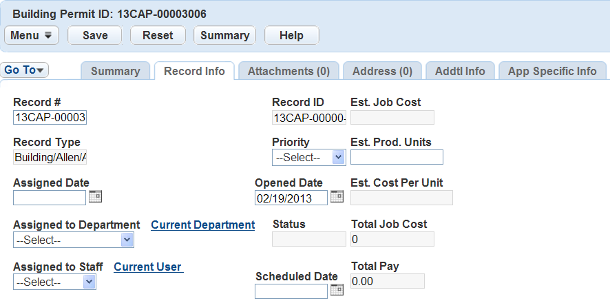 The record detail tabs by default include every detail about a record that Civic Platform can support. If you want to select and display a few tab items instead, you can create a tab menu and add the desired tab items in the tab menu. Then the detail tabs only display the tab items in the tab menu. Users can quickly and easily grasp what they want to know about a record and what they should do for the record.