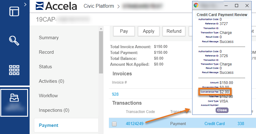 Click the Transaction Code. The fee should display in the Convenience Fee field.