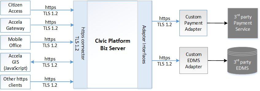 The following logical diagram illustrates the inbound and outbound https Civic Platform server connections enabled with TLS 1.2: