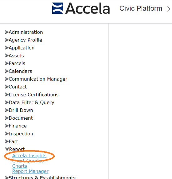 You can open Accela Insights from Accela Administration by clicking Report > Accela Insights.