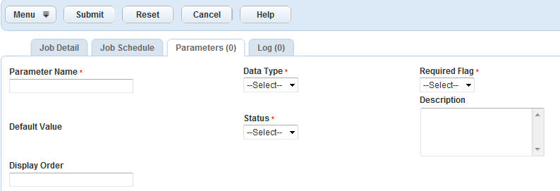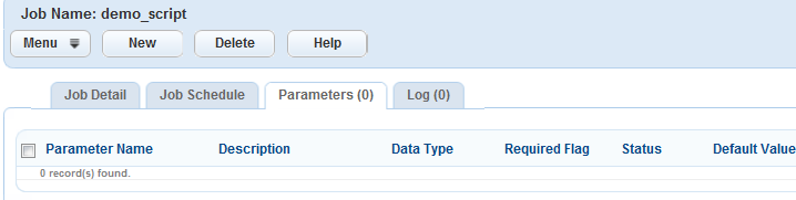 Table 1. Script Batch Job Parameters Data Type Enter the data type of the parameter. The data type must correspond to the data type defined for the parameter in the script. Default Value Assign a value to the parameter for the script to run. Description Enter a description for the parameter. Display Order Not applicable. Parameter Name Enter the name of the parameter. Required Flag Select the required flag as Yes. Status Use the drop-down to select if the parameter record is active or inactive for the script.