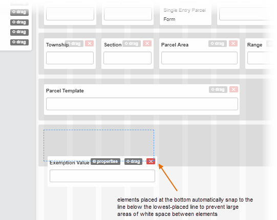 If you want to add something to the bottom of the screen, the grid also prevents large areas of white space from appearing at the bottom of the form by automatically aligning the added element to the previous lowest element. You can, however, have as many lines as elements are available for a form. You are not limited by the vertical height as you were with the old designer.