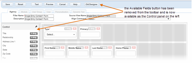 You may notice that the Available Fields button on the toolbar is missing in the new Form Designer. This is now a Control panel that scrolls with the page as you are designing the form.