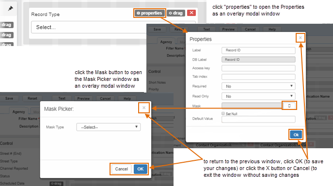 Previously, when editing field properties in the old Form Designer, a Field Properties window displayed for administrators to edit. Because this and any other options were separate windows, it could be a confusing and cumbersome process. With the new Form Designer, the properties open as pop-ups in the same window where you are editing forms in the order that you clicked them. You must now click OK, Cancel, or the X button (which acts like the Cancel button) to return to the form being edited.