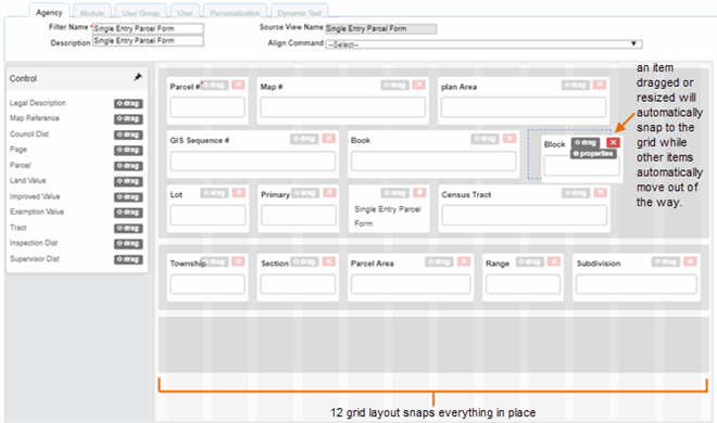 The new Form Designer layout has 12 grids that define the shape of all of the available fields and elements. Each element automatically snaps to one of the 12 grid slots, making a more uniform appearance for all the forms. An improvement from the last designer is that if you overlay any element on top of another, whether by moving it or resizing it, the field that was in that spot automatically shifts over to allow the new field. No fields can be on top of another, eliminating the error when trying to save the form.