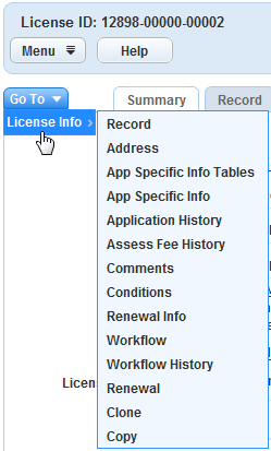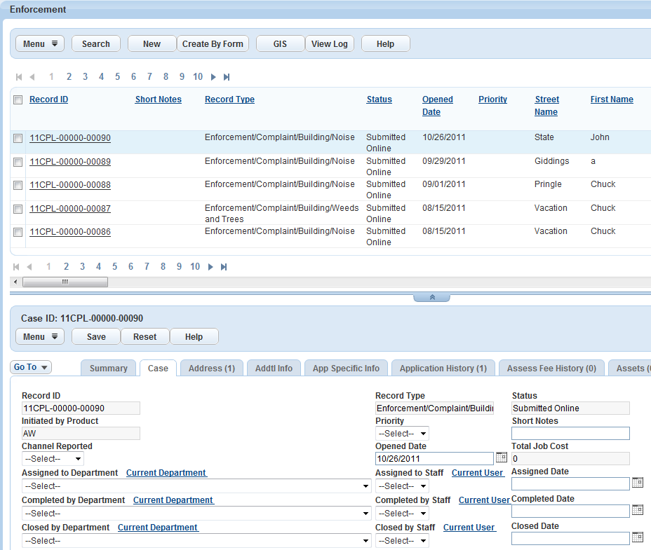 Civic Platform displays editable detailed form data, for the highlighted record, in the bottom section of the portlet. You can view different categories of detailed record data by clicking on the tabs.