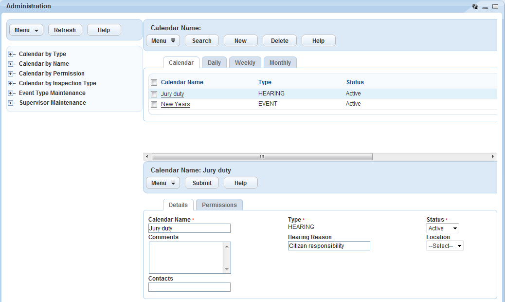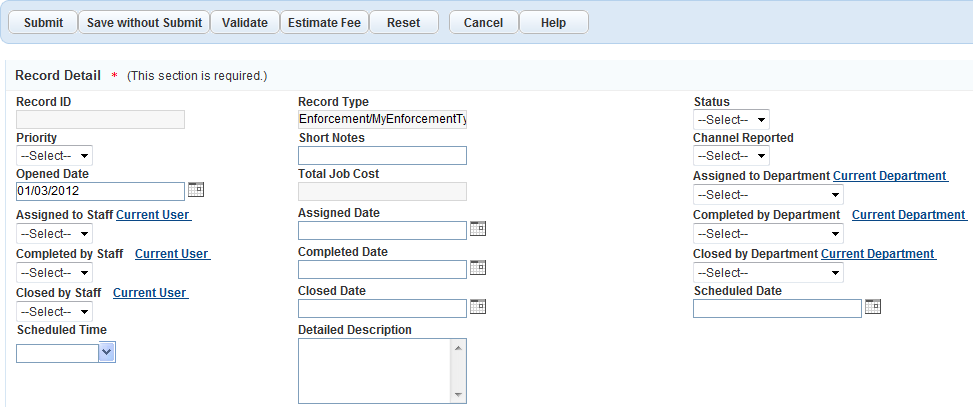 Civic Platform uses form portlets to display forms for collecting details about a single object such as a permit, application, service request, or address. Some fields contain information that you can modified. Fields may require the entry of numeric values, text values, or date values. A field may require you to choose an option, or pre-defined value from a drop-down list. Top Section of ASI Form shows part of a form that users complete when creating new records.