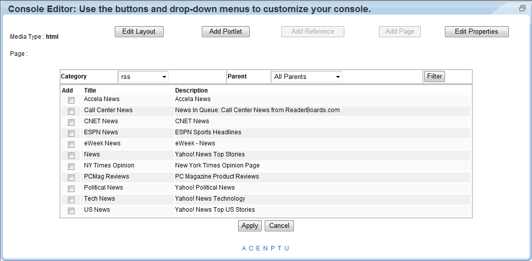 You use Civic Platform portlets to perform administrative tasks, work on form data, and process records. Civic Platform provides over one hundred default portlets for your use (Page One of OOTB Portlets). Most of these portlets directly relate to Civic Platform processes or record types; a couple portlets involve Citizen Access and several portlets involve RSS feeds to external data sources (RSS Feed Portlets); two portlets, Accela Custom Portlet and Accela Custom Report, allow you to add custom portlets and custom report portlets to the console.