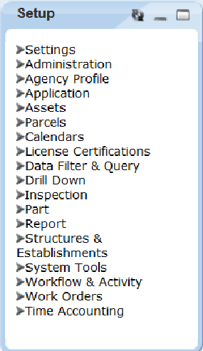 The Setup portlet (Setup Administration Portlet) provides a menu with expanded options and drop-down selections that link to specific administration portlets.