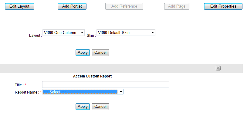 Accela Custom Report Configuration shows the Title and Report Name fields you need to specify for the custom report. The title displays as the portlet name, and the report name options are all the reports you configure in the Report Manager.