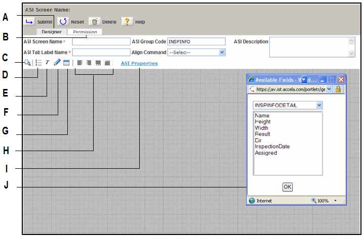 | J | Available Fields window. This window displays all available fields for the APO Type, ASI Group Code, Asset Template ID, and TSI Group Code. Double-click the field name to add it to the form. |