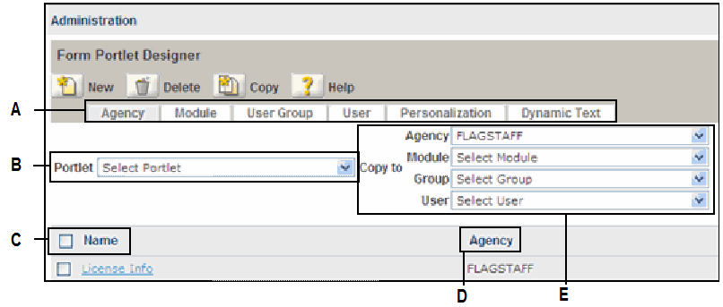 | B | Portlet and Copy to drop-down lists specify the portlet and level at which to apply portlet design changes. The Agency tab can only apply settings at the Portlet (or view name/form name) level. The Module tab can apply settings at the Agency and Portlet level. The User Group tab can apply settings at the Agency, Module, and Portlet levels. |