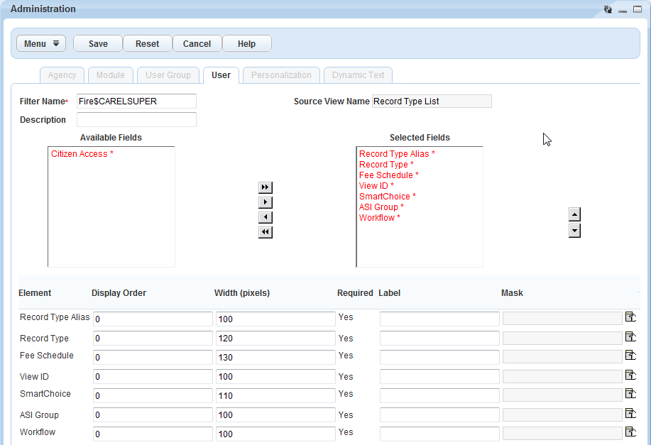 | A | Tabs identify the level at which you want to customize a of portal. Agency specifies all portals in the agency. Module specifies portals defined at the solution module; Building, Enforcement, or Licenses for example. User Group specifies portals defined for a particular user group; building, cashier, permit processor, permit supervisor, inspector, or clerical. User specifies portals defined for an individual user within a user group. Personalization specifies the view, for individuals who have the permission to change their individual screen views. Dynamic Text allows users to switch the display language text. |