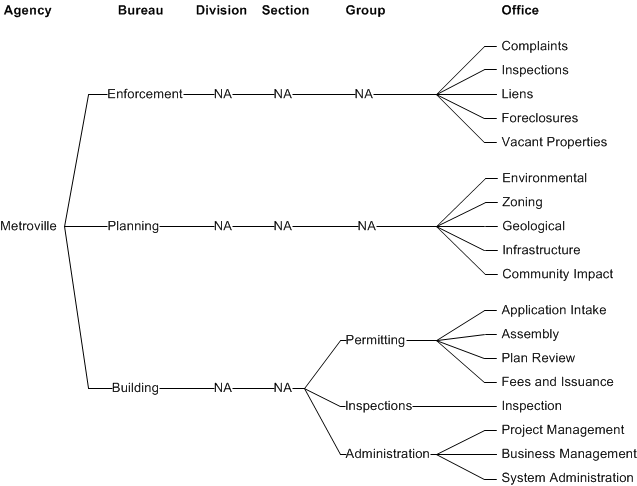 Example Organization Structure provides an example organization structure for the Metroville agency (Service Provide level not shown) The Enforcement, Planning, and Building modules represent the organization structure at the bureau level. For the Enforcement and Planning modules, no additional organization structures beyond the office level make sense. For the Building module, discrete organization processes revolve around permitting, inspections, and administration. Within each of these groups we define offices performing discrete functions within the group.