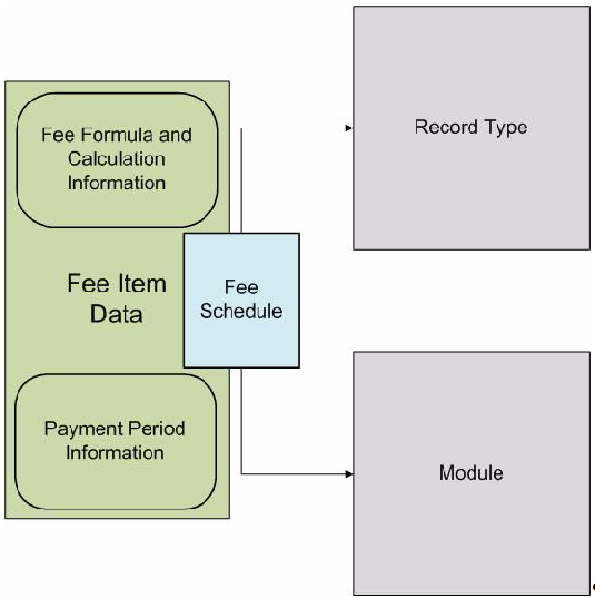 Civic Platform uses fee schedules to organize individual fee items. Fee schedules provide the connection between fee items, modules, and record types (Fee Components for Implementation).