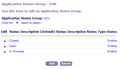 Application status groups comprise a common set of status values that apply to one or more record types. Civic Platform applies these status values to record type instances at various stages of their lifecycle.