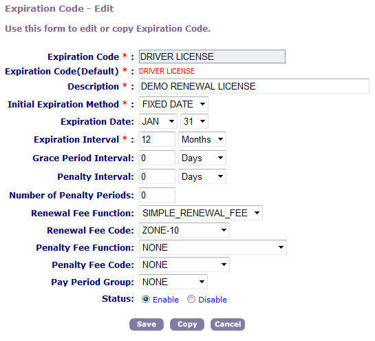Civic Platform uses expiration codes to manage renewals of license record types. The expiration code associates various parameters that apply to a license renewal record such as expiration date, interval, grace period, penalty period, and fees.