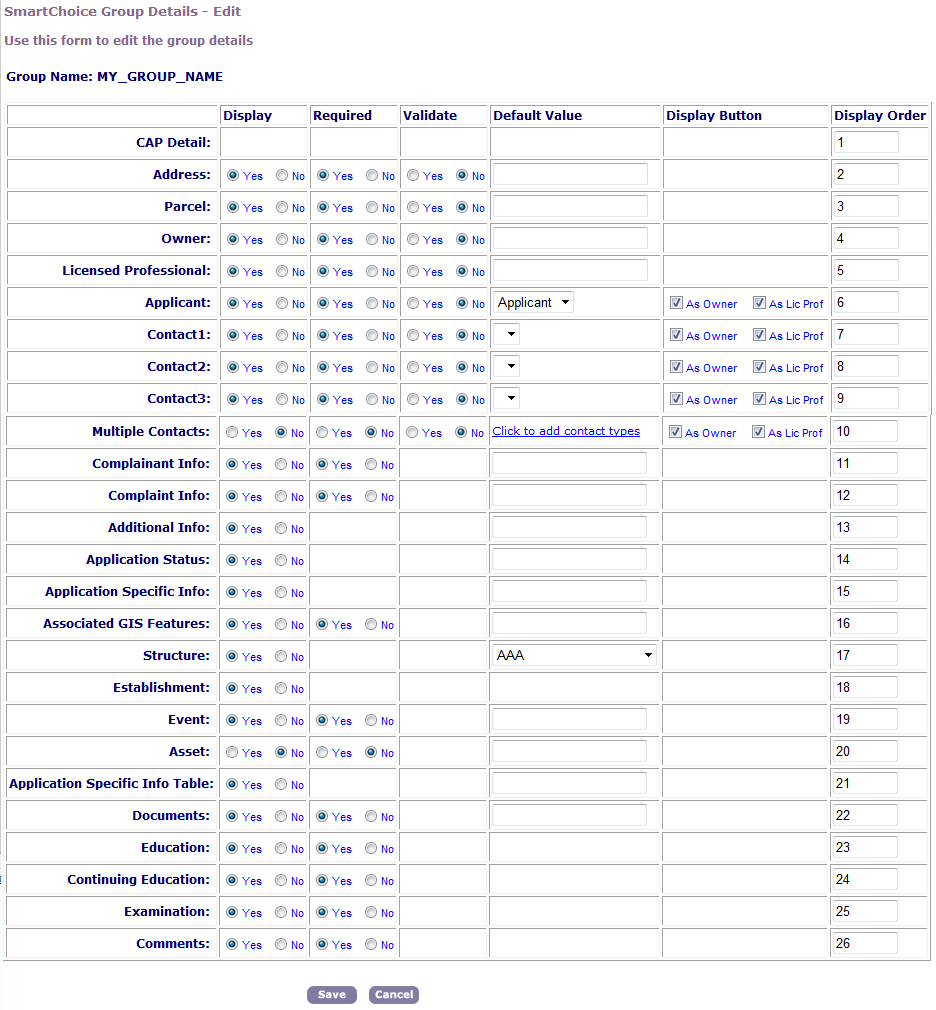 | Application Specific Info Group (Application Specific Information Groups) | Application Specific Info Group | The name of the ASI group and subgroups associated with instances of the record type. |