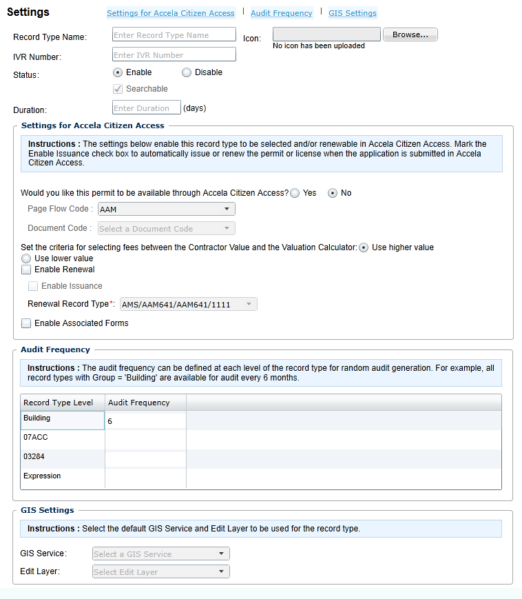 | Page Flow Code | Sets the Citizen Access page flow code for this record type. | |
