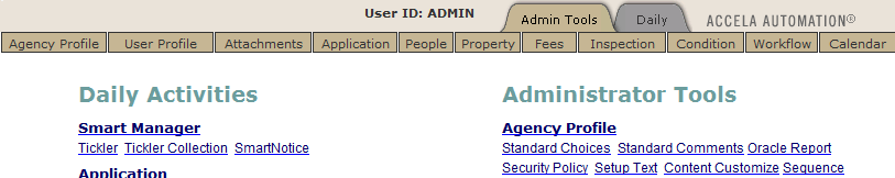 The Classic Admin Tools are organized into function groups, such as Fees, Workflow, or Applications. Within each group is a set of tools that support the function. For example, the User Profile group includes the Organizations, Groups and Users tools. Civic Platform uses Function Identifications (FIDs) settings to determine the availability of each tool.