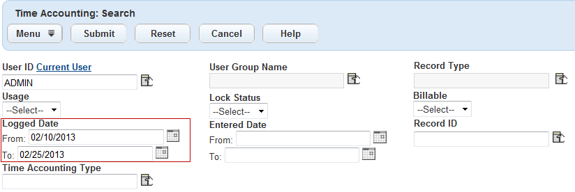 If the Standard Choice is undefined, the default Logged From Date is one week before the current date (the default Logged To date).