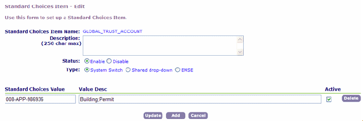 Agencies can assign one or more global trust accounts as global to Civic Platform users. If a trust account is global, then it is available to all records within one or more modules.